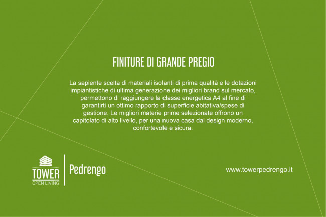 Tower Pedrengo è il nuovo progetto di residenza sostenibile. Un nuovo intervento di riqualificazione dove il verde è il protagonista indiscusso. Costituito da 12 quadrilocali, 4 appartamenti a piano terra con ampio giardino e 8 appartamenti con terrazze piantumate nei piani superiori, di cui 2 con spaziosi super attici dalle linee pulite e moderne, progettate per rilanciare la bellezza del tessuto residenziale nel quale si inseriscono. Un progetto unico in cui gli elementi portanti sono la privacy e le terrazze open living, un secondo salotto all'aperto in cui trascorrere momenti sereni abbracciati dalla natura.