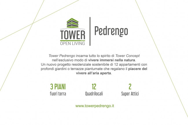 Tower Pedrengo è il nuovo progetto di residenza sostenibile. Un nuovo intervento di riqualificazione dove il verde è il protagonista indiscusso. Costituito da 12 quadrilocali, 4 appartamenti a piano terra con ampio giardino e 8 appartamenti con terrazze piantumate nei piani superiori, di cui 2 con spaziosi super attici dalle linee pulite e moderne, progettate per rilanciare la bellezza del tessuto residenziale nel quale si inseriscono. Un progetto unico in cui gli elementi portanti sono la privacy e le terrazze open living, un secondo salotto all'aperto in cui trascorrere momenti sereni abbracciati dalla natura.